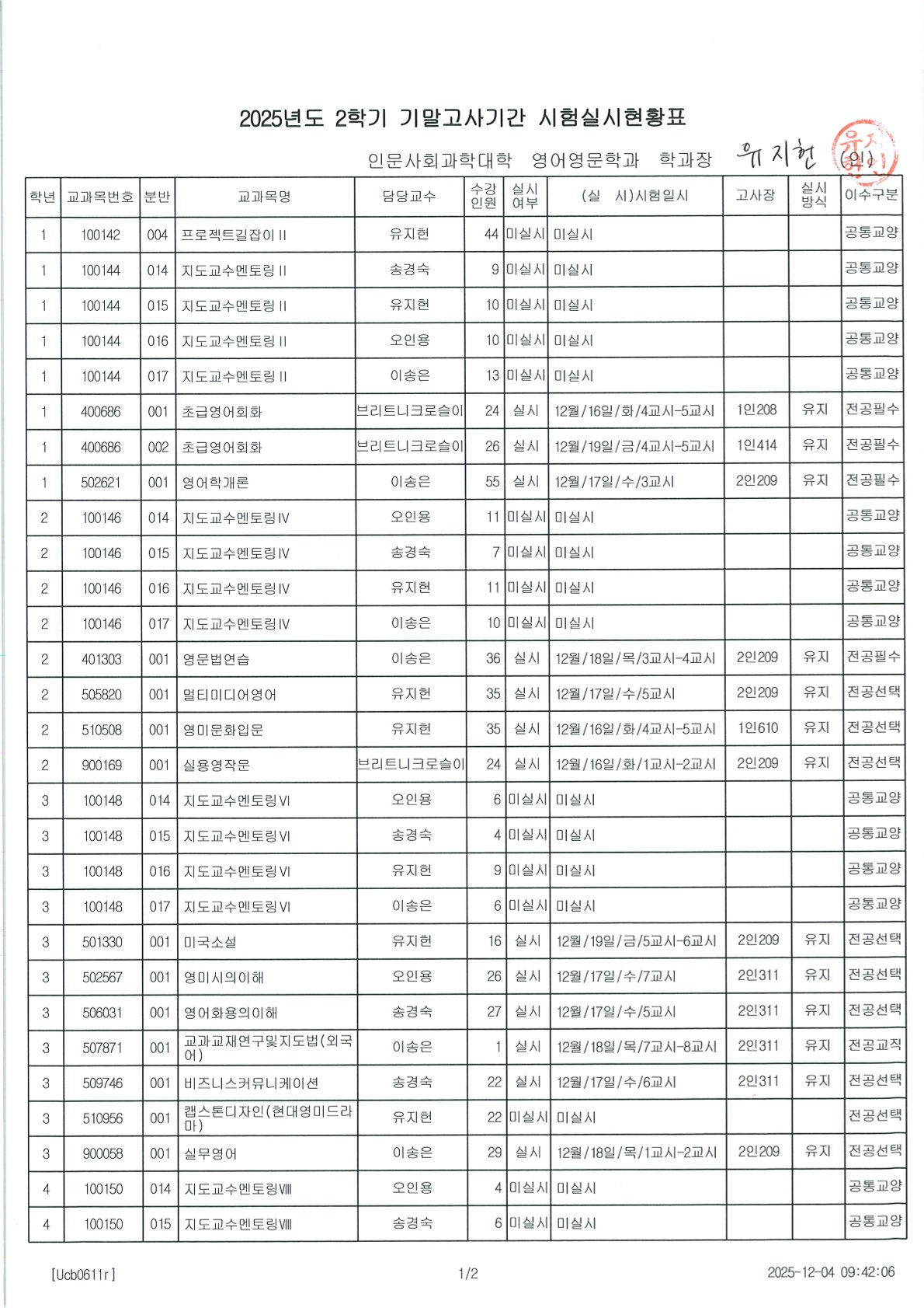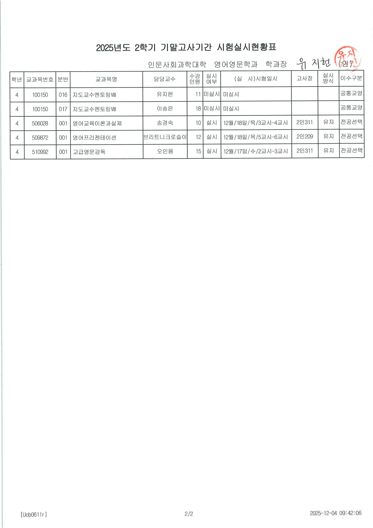 2025-2학기 영어영문학과 기말시험 시간표 공지