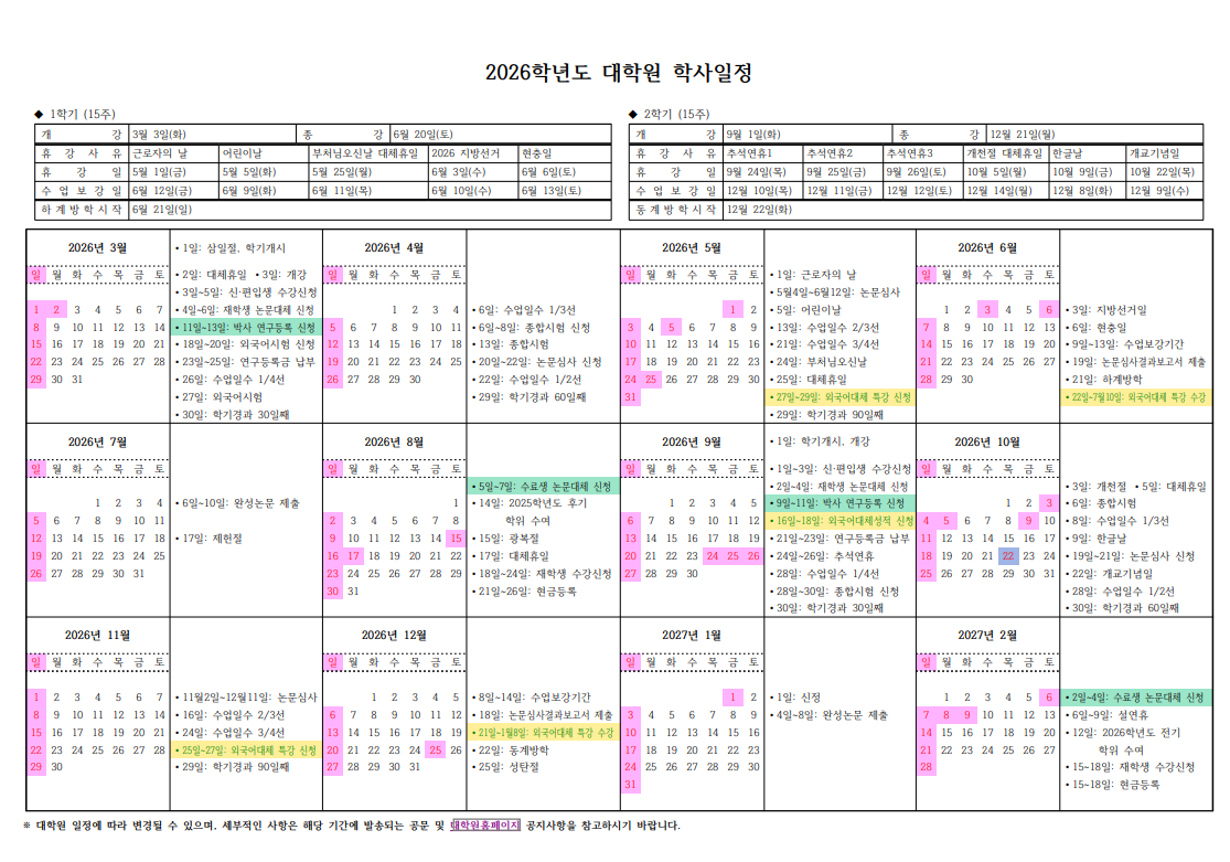 2. 대학원 홈페이지 학사안내 → 학사일정에도 공지되어 있습니다.